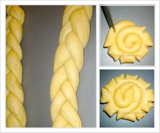 Bon je sais c’est plus facile à dire qu’à faire, mais tu verras en pratiquant un peu, que pour faire de jolis pains il suffit de jouer avec les tresses, de les enrouler de la facon dont tu veux. Pour avoir parfois des idées, je vais dans “google image”, je tape “pain au beurre” et je regarde les belles réalisations qui m’inspirent beaucoup.