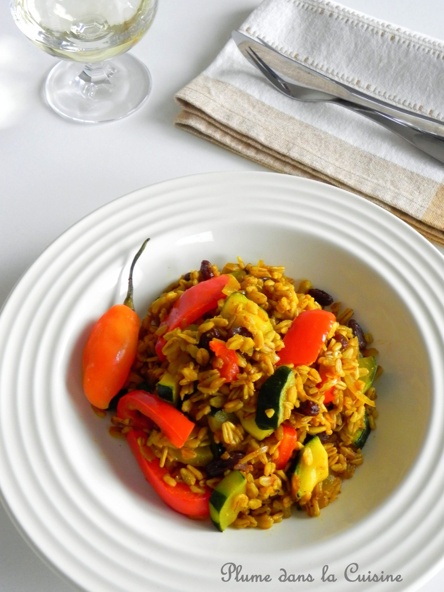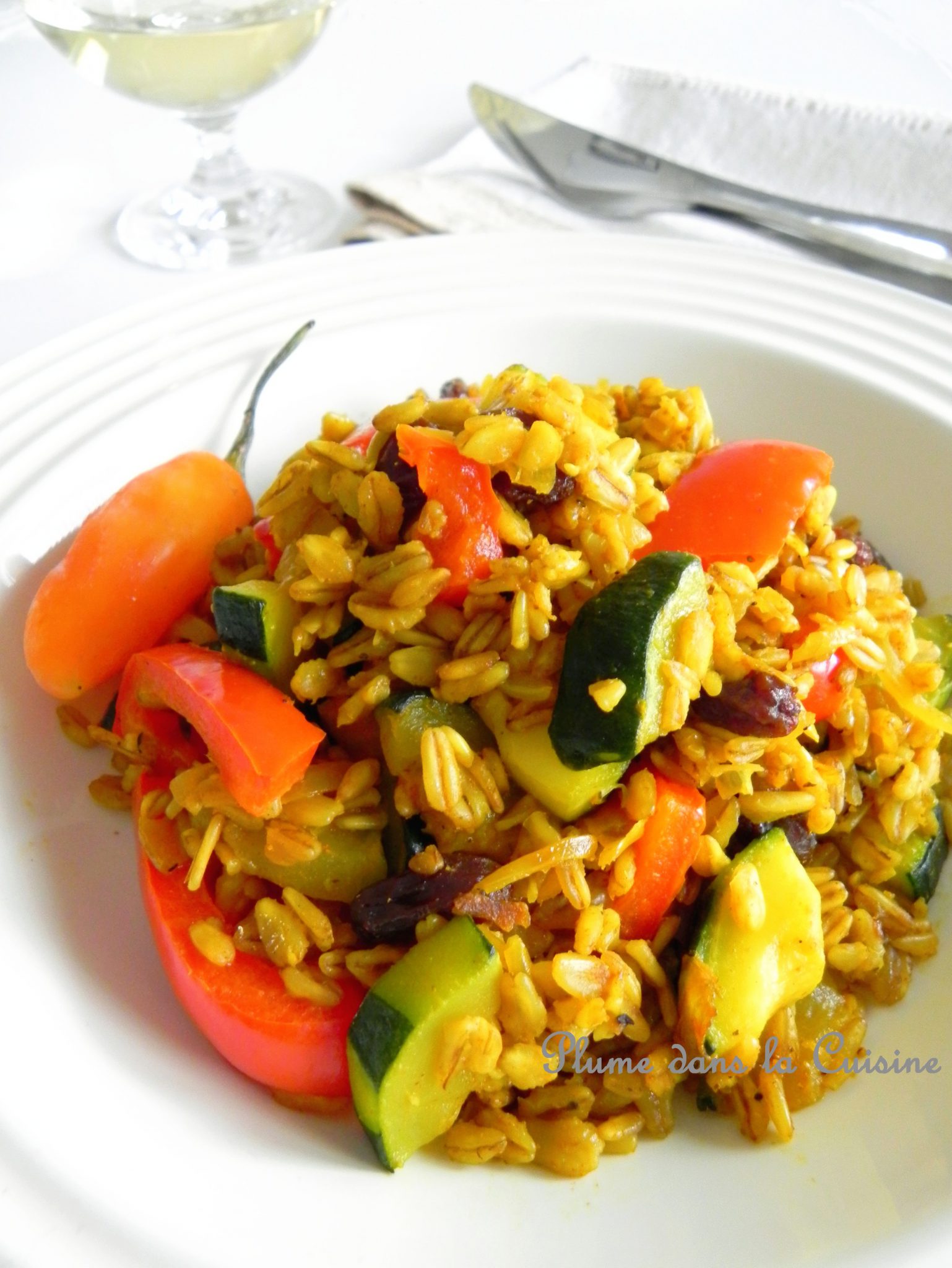 Du blé pleins de légumes et relevé au colombo, voici un plat simple, équilibré et complet, très apprécié chez nous. Enfin nous les adultes, pas les enfants, mais là on ne les compte plus car s’il fallait tenir compte que de ce qu’ils aiment en ce moment, je crois que je ne cuisinerais plus que des pâtes et des frites!