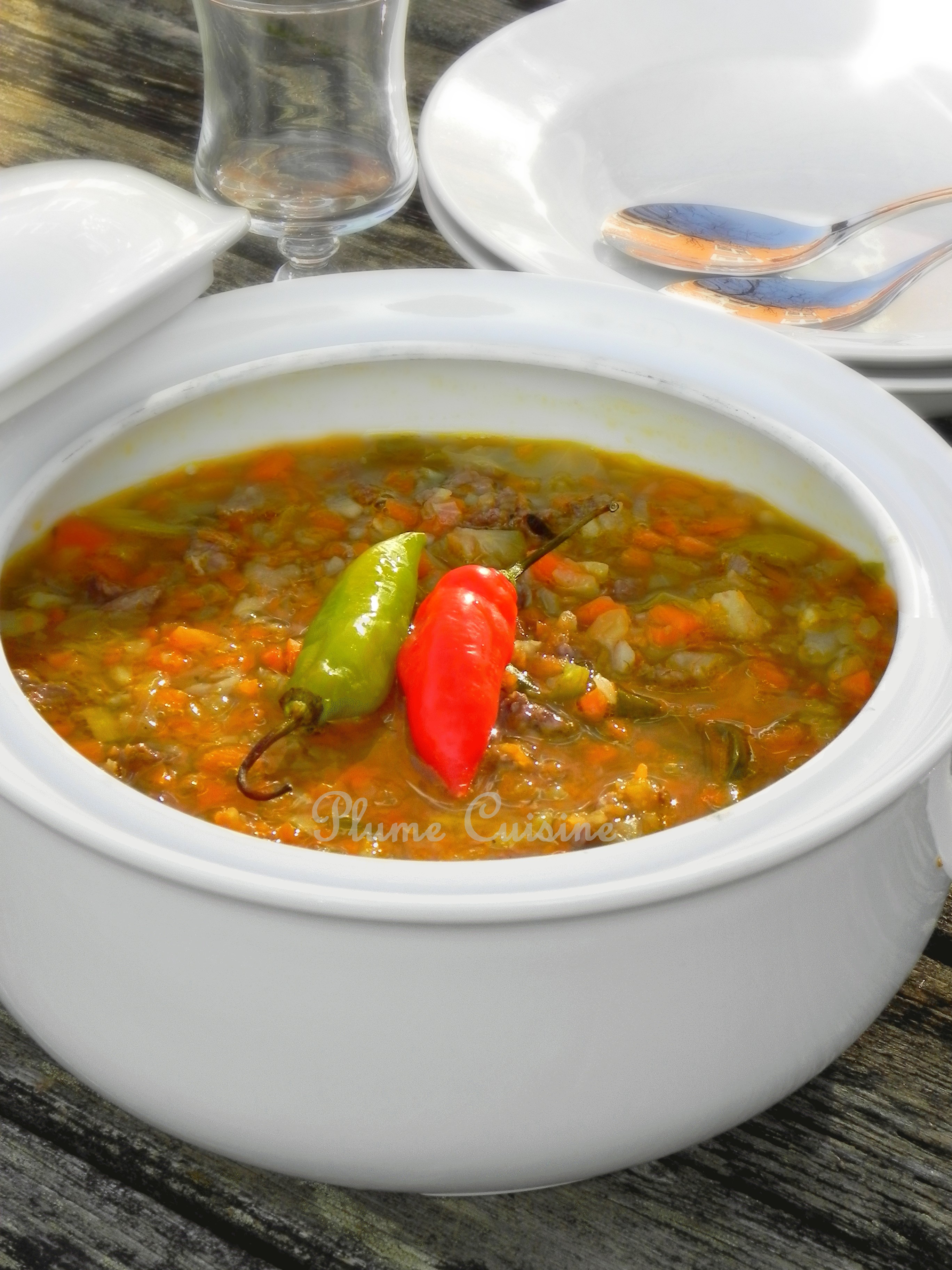 je suis en train de suivre ta recette carj’ai habité en Martinique et j’aimais beaucoup cette soupe ( sauf quand il y avait dedans des testicules de mouton ! ). Je ne sais pas encore si ça va être bon, mais quel boulot de tout couper en petits bouts !